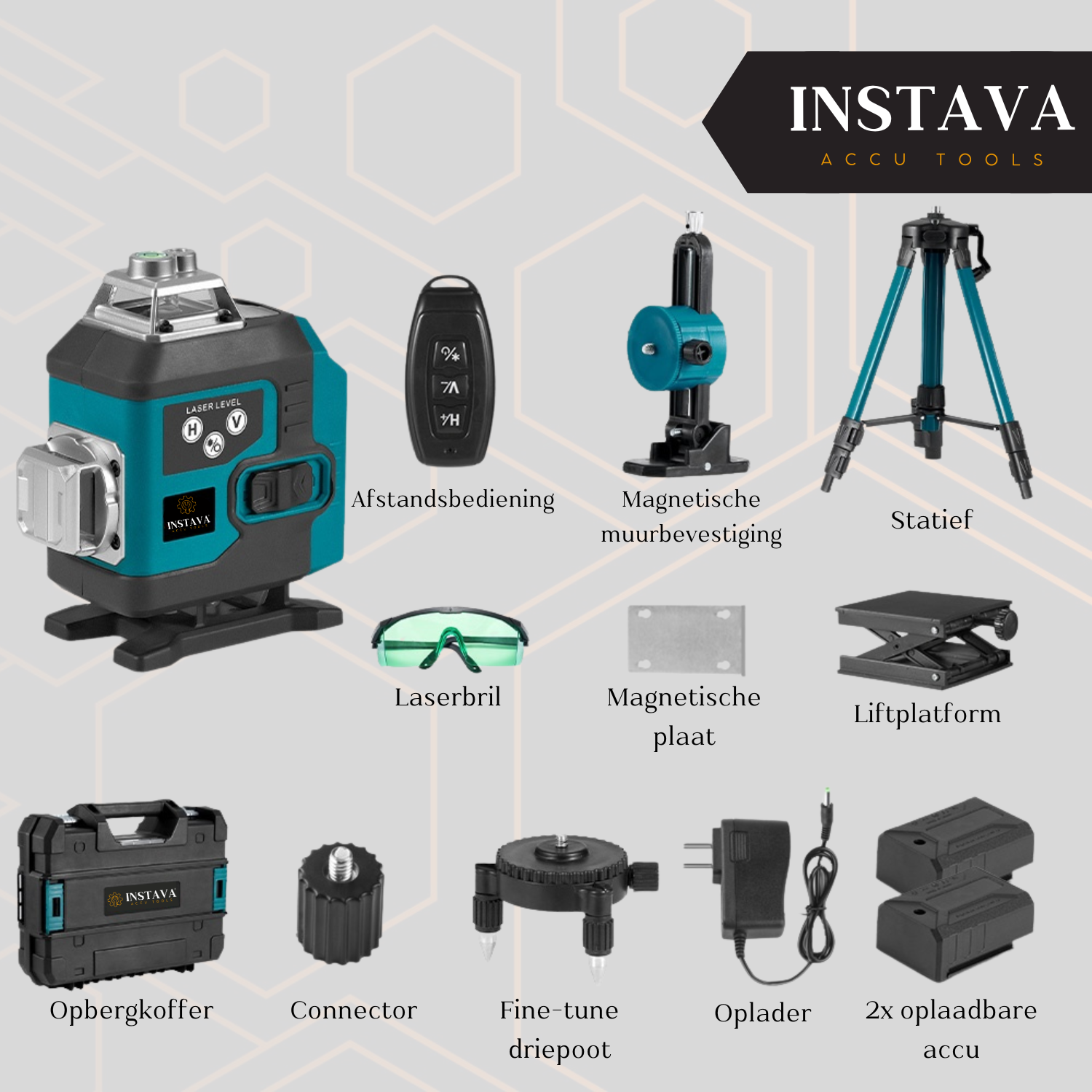 De Instava 4D 16-lijn Draaibare Kruislijnlaser is een zelfnivellerende laser met 360° graden groene draaibare lasers. Het wordt geleverd inclusief 2x accu en een stevige opbergkoffer. Het is ideaal voor zowel binnen als buiten gebruik en zorgt voor nauwkeurige meetresultaten.