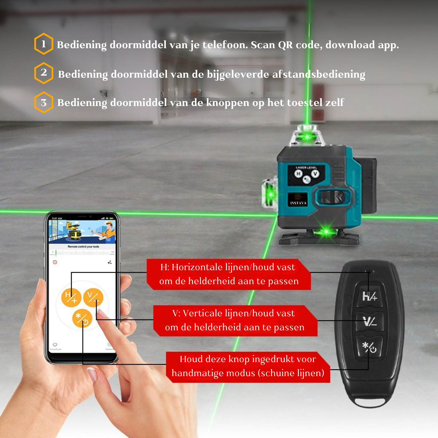 - Met de Instava 4D 16-lijn Draaibare Kruislijnlaser kun je eenvoudig en nauwkeurig lijnen uitzetten voor verschillende klussen.
